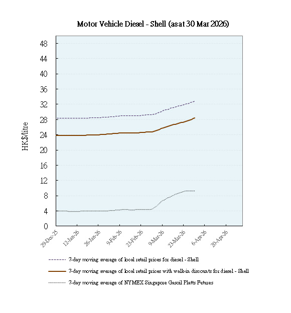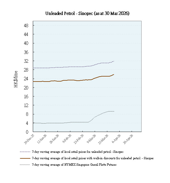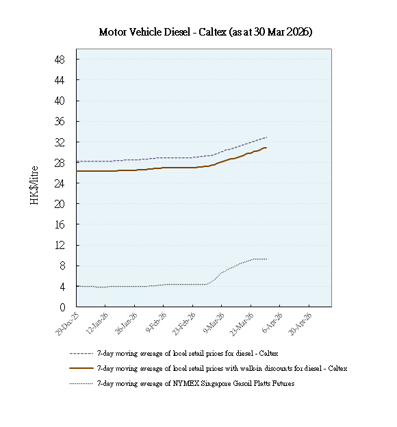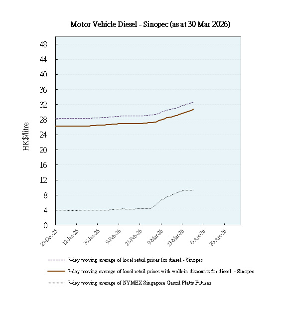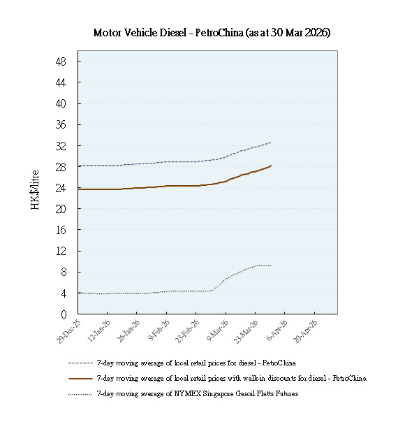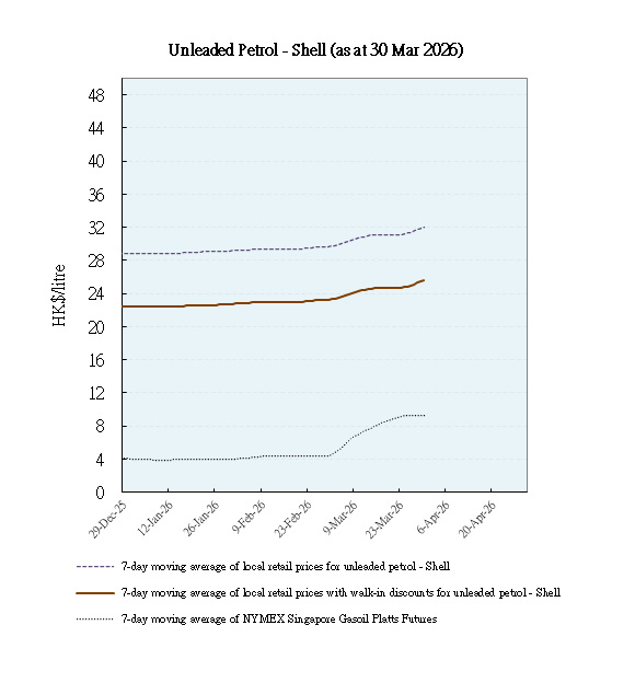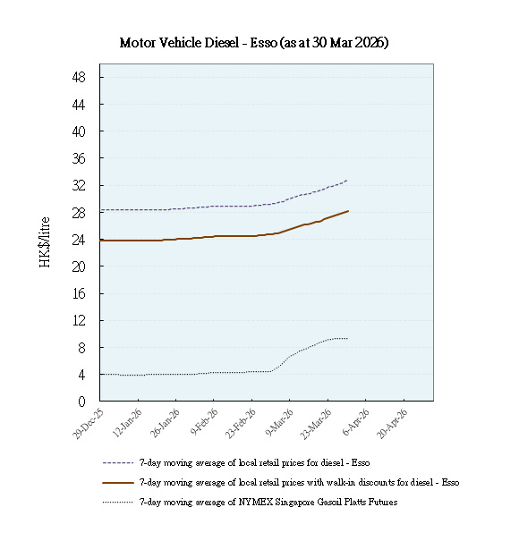 With effect from 1 April 2026, to facilitate the public to monitor trends of local retail prices of auto-fuel among oil companies as well as international prices of refined oil products so as to assess whether these prices are moving in tandem and the extent of such changes, the Environment and Ecology Bureau (EEB) will release on a weekly basis the trend movements of retail prices of auto-fuel, net of walk-in discounts, of unleaded petrol and diesel of the local oil companies, together with the trend movements of the international refined oil product prices for the corresponding period.