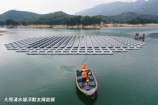 當中,WSD正着手研究在水塘使用浮動太陽能發電系統的潛力,在石壁水塘和船灣淡水湖已安裝了各100千瓦的小型系統為先導計劃,並快將在大欖涌水塘完成第三套小型系統。香港將投資更大型的浮動太陽能發電系統,年產量可逾1億度電,即等於約0.2%全港用電量。