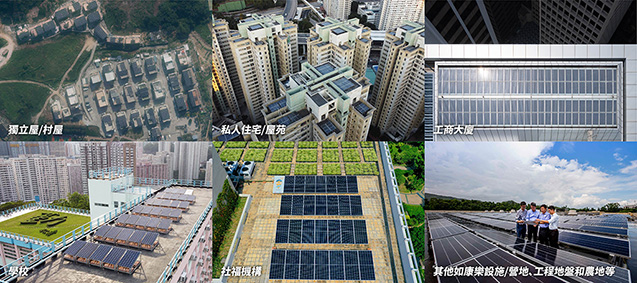 - 政府處所加裝各式太陽能板 (如於污水處理廠、政府合署、宿舍、康樂休憩場地及行人通道等)