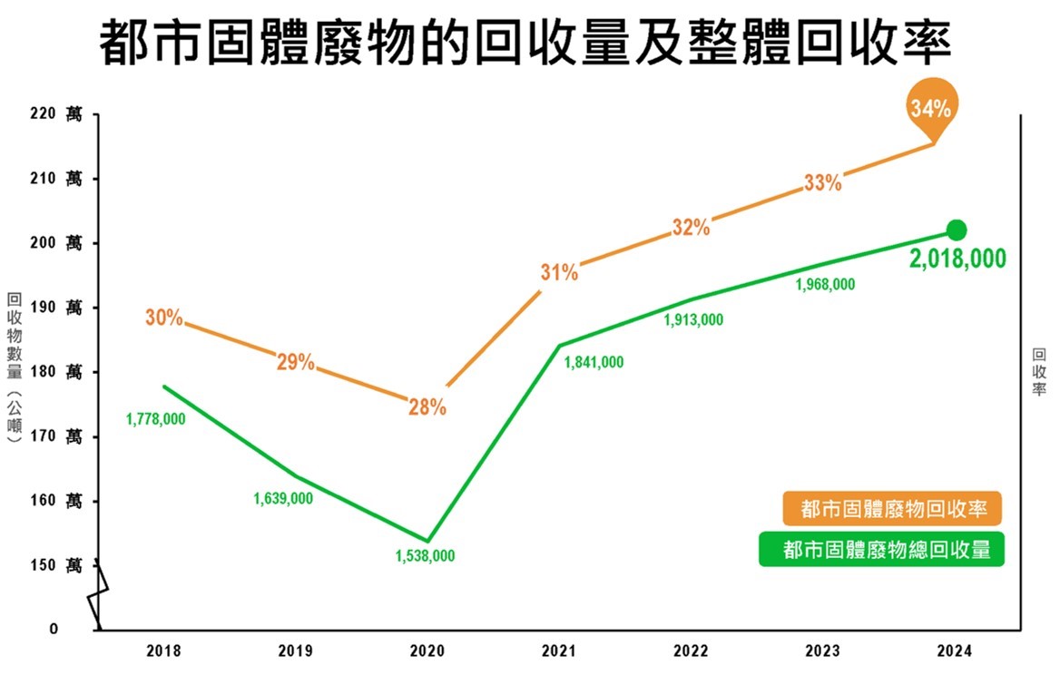 本屆政府推動減廢回收的成果,不單止反映在垃圾棄置量下降,整體回收率亦正在上升。總回收量由2020年的低位約154萬公噸增加至2024年約202萬公噸,增加了約48萬公噸,回收率亦由28%上升至34%。